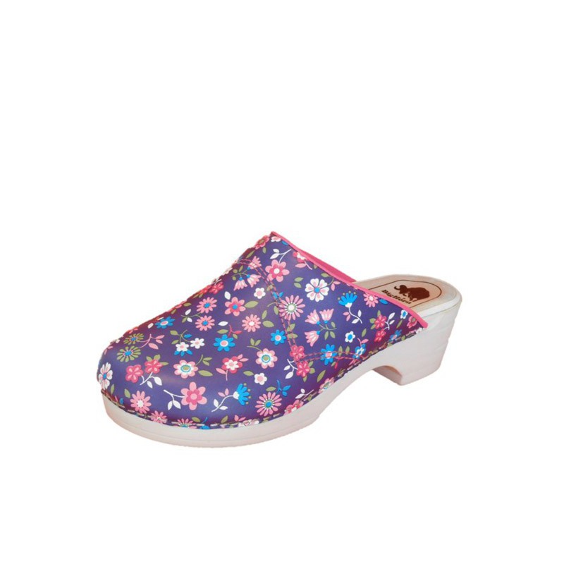 De Bighorn 5001 bloem paars gezondheidsklompen met kleurrijk bloemenmotief zijn voorzien van een PU zool. Deze gezondheidsklomp van medischeklompen.nl heeft een goed gevormd voetbed voorzien van een extra zacht hielstuk. De structuur van de PUzool maakt deze verpleegkundige klompen geluidsarm en geeft optimale anti-slip.