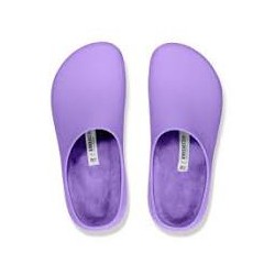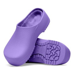 De Super Birki's van Birkenstock zijn waterdichte klompen. Deze paarse uitvoering heeft een verwisselbaar bont gevoerd voetbed ook in de paarse kleur, De Super-Birki bestaat volledig uit kunststof (ALPRO-foam) en deze unieke uitvoering heeft een uitneembaar. warm gevoerd voetbed. De klomp zelf is machinewasbaar op 60 graden. Dankzij de duurzaamheid en hygiënische eigenschappen van deze werkklompen zijn ze geschikt voor keuken, gezondheidszorg en levensmiddelenindustrie. Maar kan ook prima gedragen worden als tuinklomp of in de de vrije tijd. De wasbare klomp heeft een goede anti-slip en is schokdempend.