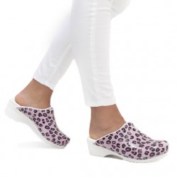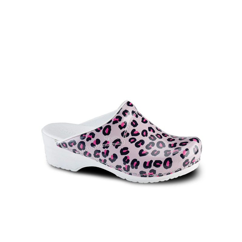Sanita klompen flex 314 Wild life Leopard roze zijn nieuwe panter klompen in het assortiment van Sanita medischeklompen. Deze gevlekte panterklompen zijn gemaakt in de kleuren oudroze en fuchsia. Deze verpleegstersklompen zijn gemaakt van leer in een jungle print. De leren kap is met nietjes aan de zool bevestigd. De ziekenhuisklompen zijn voorzien van een slipvaste en geluidsarme buitenzool. Ook het orthopedisch gevormde voetbed is een kenmerk van deze verpleegkundige klompen. De structuur van de zool maakt de Sanita klompen geluidsarm en geeft een hoge anti-slip waarde aan de clogs!